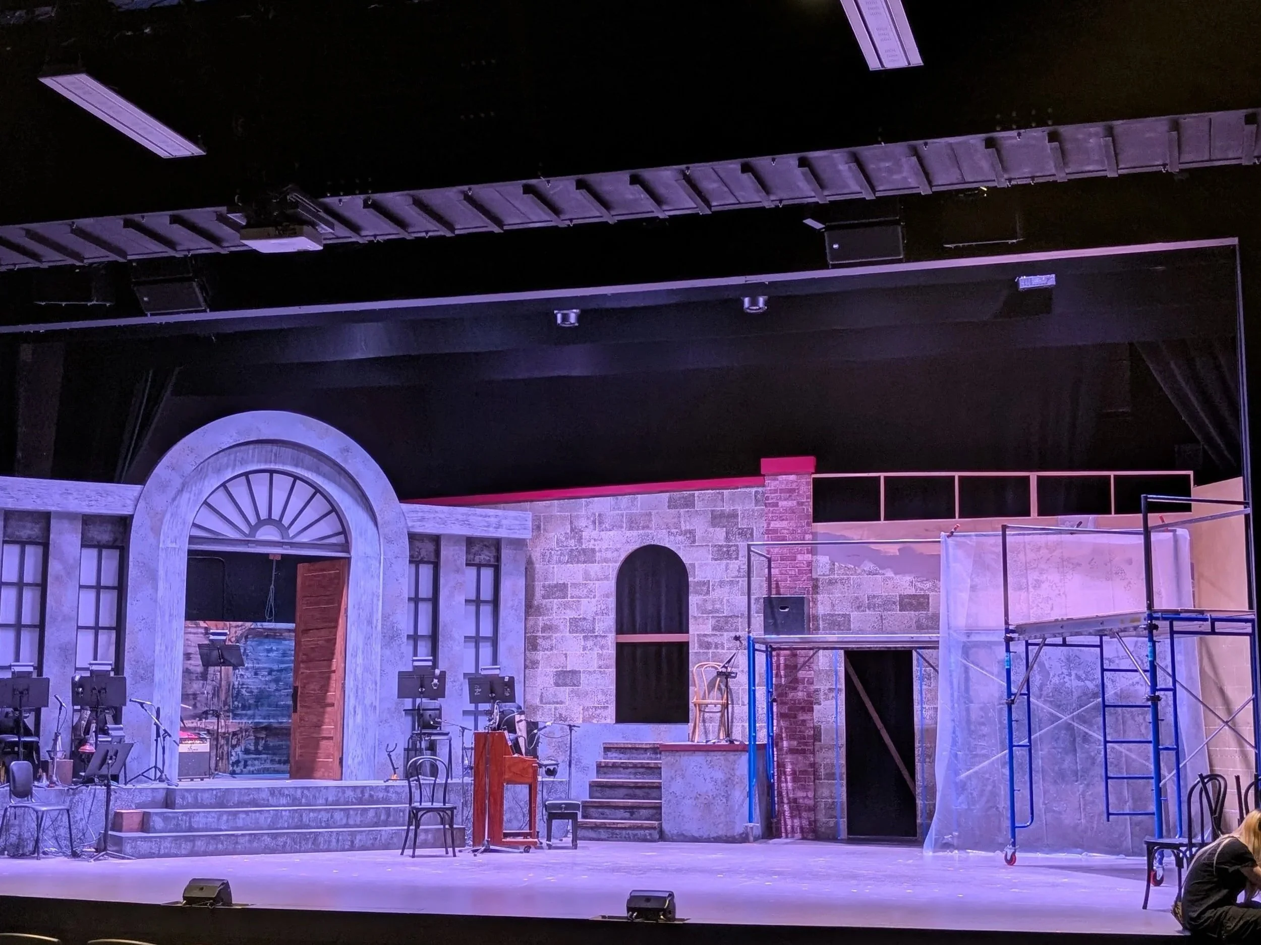 Almost all of the set for Cabaret was wooden construction, including studio flats, stage flats, and some half-lap window construction and finish carpentry. As well as being a carpenter, I was also the A2 for this show, helping to not only run the show but load in and wire all of the microphones, and learned to troubleshoot audio problems in the middle of a show.